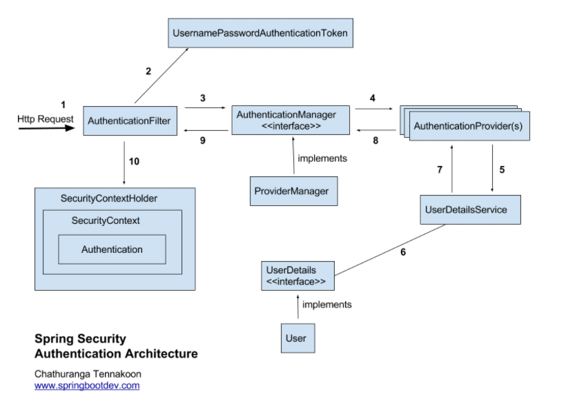 - Spring Security의 주요 목표는 Rest API endpoint, mvc url, 정적리소스와 같은 리소스들에 접근하려는 요청의 인증을 책임지는 것이다.